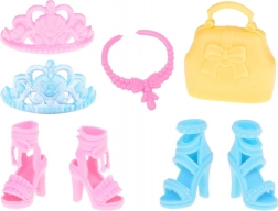 Due eleganti paia di scarpe con tacchi aggiungono fascino e stile all'aspetto complessivo. Accessori come una borsa sofisticata, una collana rosa e due corone sono perfetti per ogni piccola principessa.