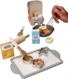 Matterello, frusta, pennelli, formine e ciotola permettono ai bambini di imitare la vera pasticceria e di esercitarsi nella manipolazione degli strumenti.