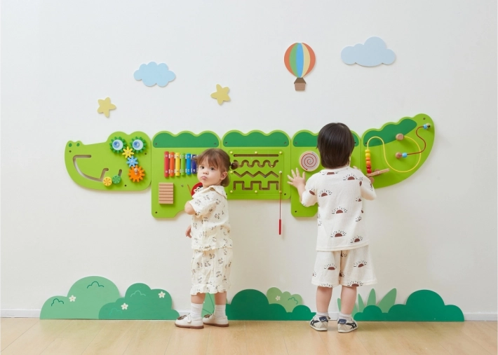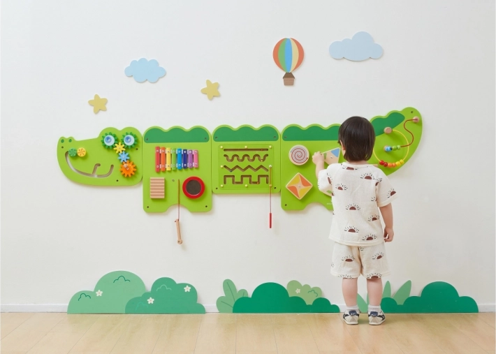 Divertente lavagna attiva da parete in legno a forma di coccodrillo che offre ai bambini dai 18 mesi ore di esplorazione sensoriale e allenamento della motricità fine. Include xilofono, ingranaggi, labirinti, elementi scorrevoli e rotanti e perline su filo, che sviluppano coordinazione occhio–mano, pensiero logico e senso musicale. Il montaggio a parete fa risparmiare spazio ed è ideale per camerette, asili e aree gioco.
