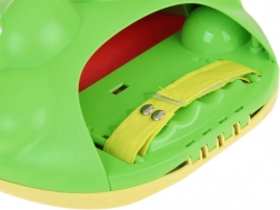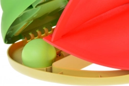 - Sul lato della catapulta c'è un zip bianco – spingilo per aprire la bocca della rana e inserire la pallina.