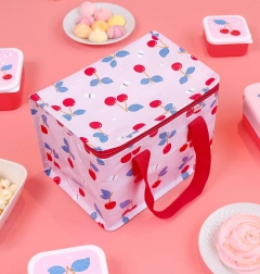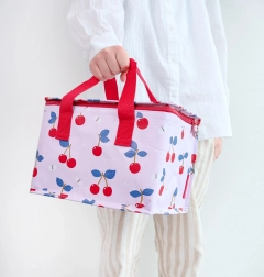 Borsa frigo con motivo ciliegie ideale per mantenere cibi e bevande al fresco. Offre spazio sufficiente per contenitori da pranzo, bottiglie d'acqua e frutta e verdura fresche.