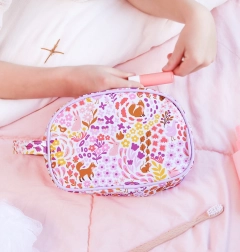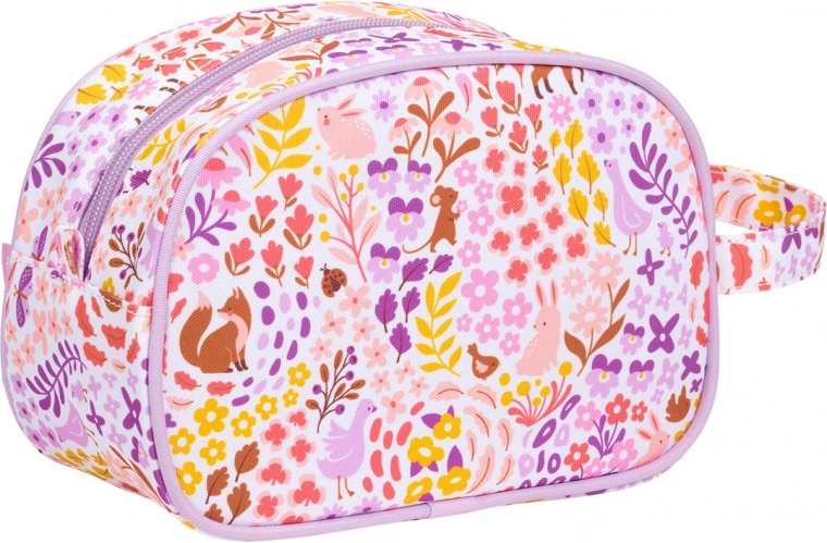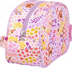 Goditi una pratica borsa da toilette lilla chiaro con una stampa animale unica nel giardino fiorito.