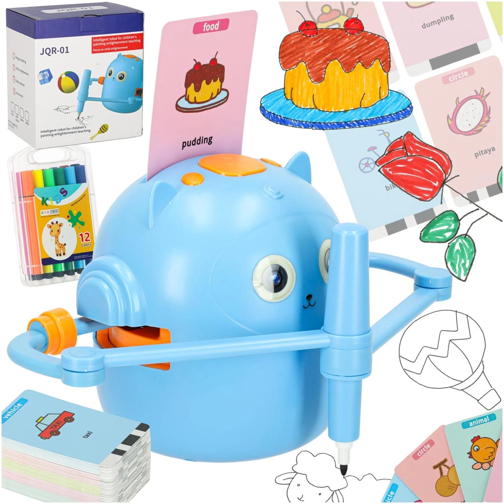 Il robot intelligente con portapenne disegna i modelli passo dopo passo in modo che il bambino possa facilmente ricalcare e colorare. Sono incluse carte di vocabolario inglese (animali, cibo, forme, veicoli, piante) che sviluppano il lessico in modo naturale. L’apprendimento avviene giocando: i bambini allenano motricità fine, concentrazione e creatività.