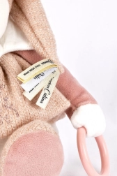 L'orsetto polare in peluche indossa un delicato cappellino rosa decorato con nastrini di raso con amorevoli messaggi in francese. Il corpo è realizzato in materiale soffice con un delicato ricamo del marchio Doudou. L'orsetto offre vari stimoli per lo sviluppo dei sensi e delle capacità motorie fini: