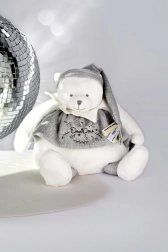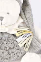 Doudou orsacchiotto di peluche è il giocattolo ideale per i neonati. Grazie al cappellino grigio decorato con nastri di raso con messaggi amorevoli in francese, l'orsacchiotto offre un tocco dolce a ogni abbraccio.