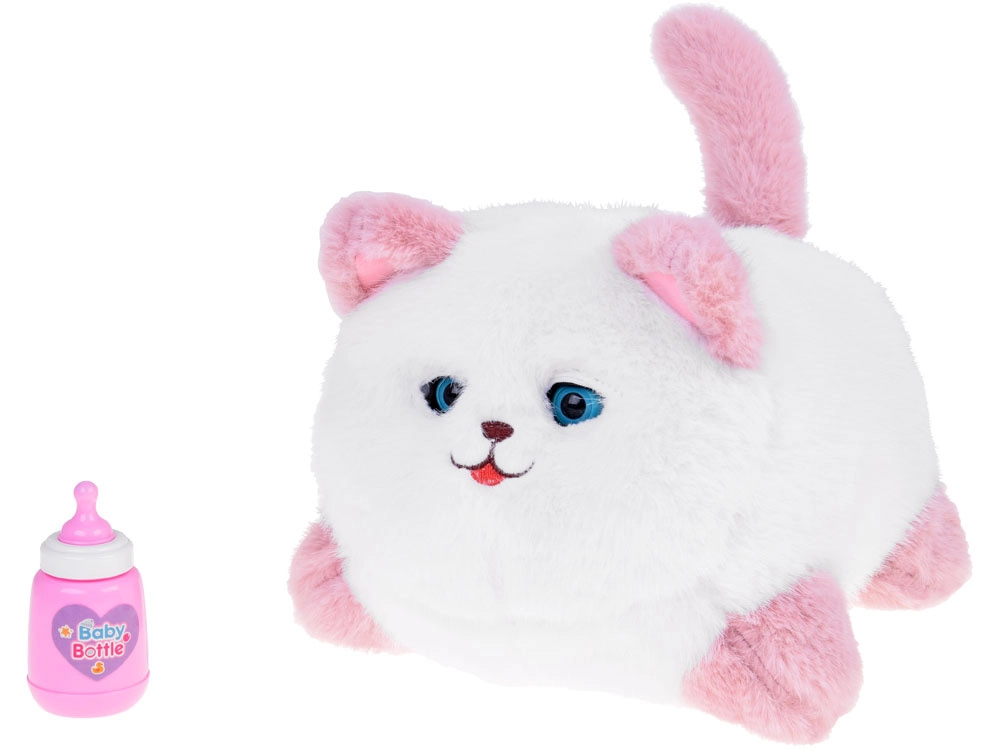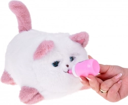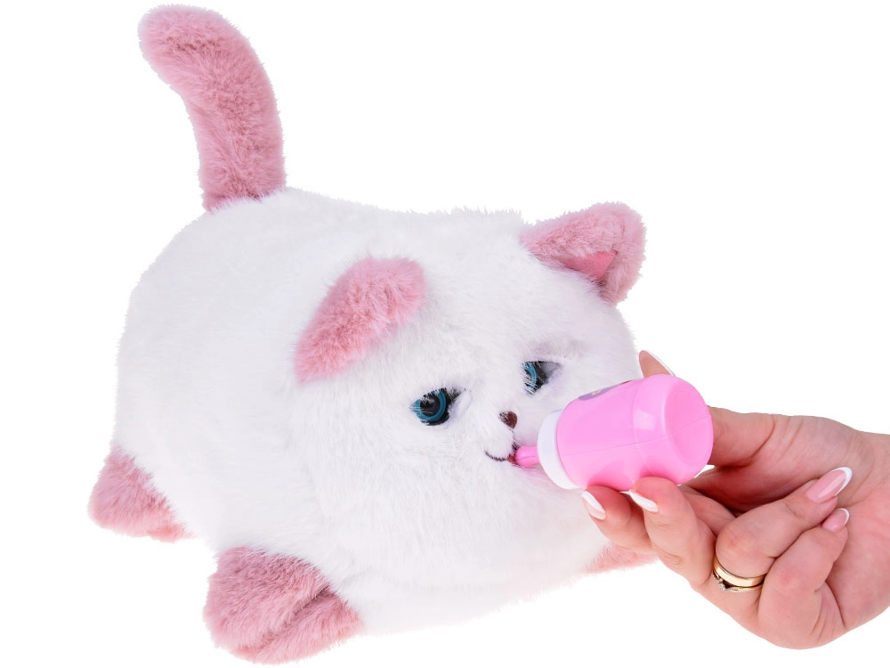 Nella confezione troverai una piccola bottiglia che puoi avvicinare alla bocca del gatto per simulare l'alimentazione con suoni di accompagnamento. Il gatto Pusia cattura e riproduce le tue parole dopo aver premuto la zampa anteriore.