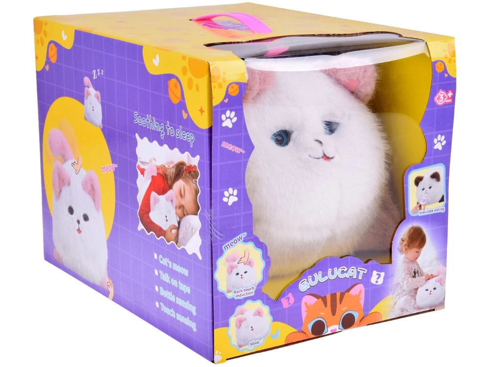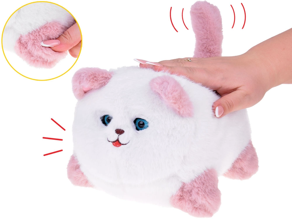 Incontra il gatto Pusia, un giocattolo interattivo che è come un vero animale domestico. Questo morbido gatto bianco con zampe rosa e coda ha funzioni sonore e di movimento sorprendenti. Accarezzandolo sulla schiena, si attivano suoni di miagolio e fusa – completati da movimenti della coda e occhi che sbattono le palpebre, creando esperienze realistiche.