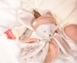 Questo orsetto di peluche è realizzato in morbido tessuto tweed rosa e decorato con delicati ricami. I grandi petali sul corpo aiutano a sviluppare la motricità fine del bambino offrendo allo stesso tempo un senso di comfort e sicurezza.