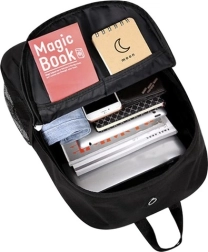 Elegante zaino nero in robusto tessuto Oxford, impermeabile e confortevole tutto il giorno grazie a schienale e spallacci imbottiti con rete MESH. La stampa riflettente luminosa aumenta la visibilità al crepuscolo e al buio, ideale per studenti, città e gite.