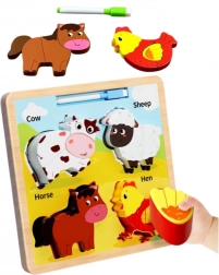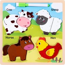 Questo puzzle educativo in legno contiene animali come mucca, pecora, cavallo e gallina, noti ai bambini. Ogni animale è composto da diversi pezzi da abbinare nella posizione corretta, favorendo lo sviluppo della coordinazione e del pensiero logico.