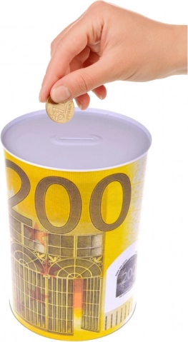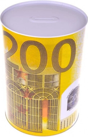 Salvadanaio in metallo a forma di lattina con motivo banconota da 200 Euro