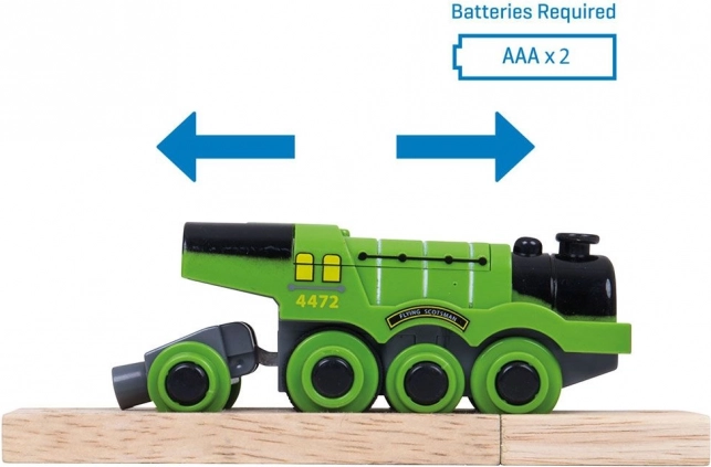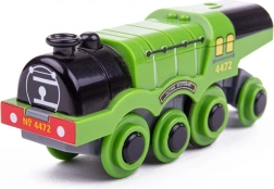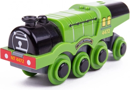 Iconica replica della locomotiva a vapore FLYING SCOTSMAN per piste ferroviarie in legno, apprezzata per la potente trazione, avanzamento automatico e controllo semplice con un solo pulsante. Grazie al sistema magnetico può trainare più vagoni, è compatibile con la maggior parte delle piste in legno e sviluppa immaginazione e motricità dei bambini.