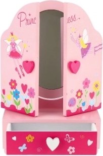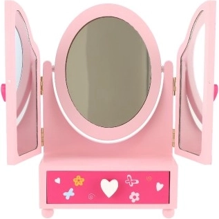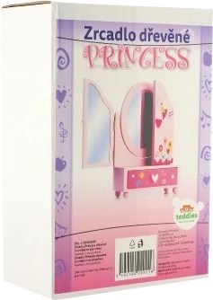 Adorabile specchiera da toeletta per bambini con portagioie a tema PRINCESS, perfetta per ogni piccola vanitosa. Specchio a tre ante con pannelli laterali per una migliore visuale, pratica cassettiera per i tesori e solida struttura in legno nel delicato colore rosa. Ideale per riporre anellini, braccialetti e perline e per stimolare il gioco creativo.