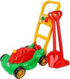 Tosaerba, accessori (paletta, rastrello, eventualmente annaffiatoio – a seconda della variante)