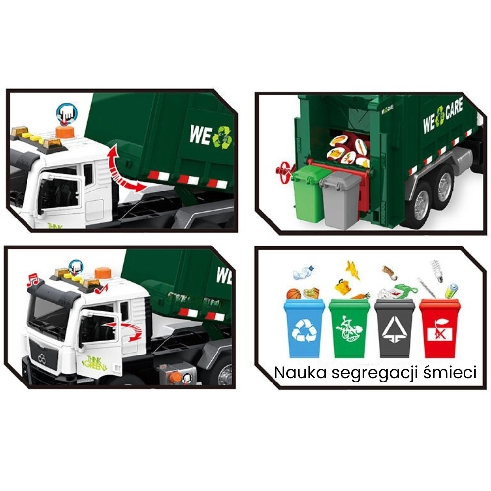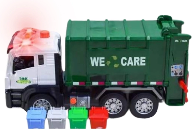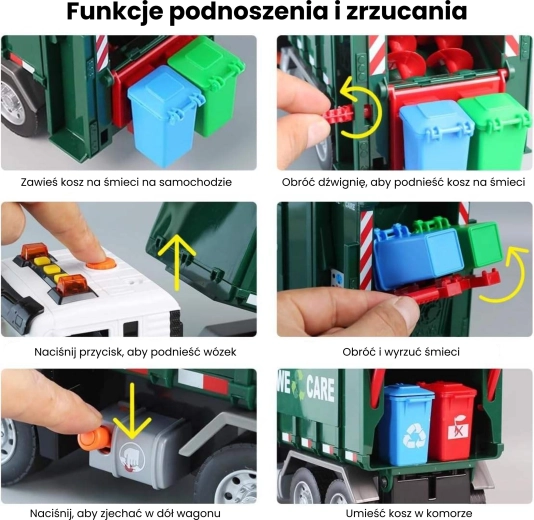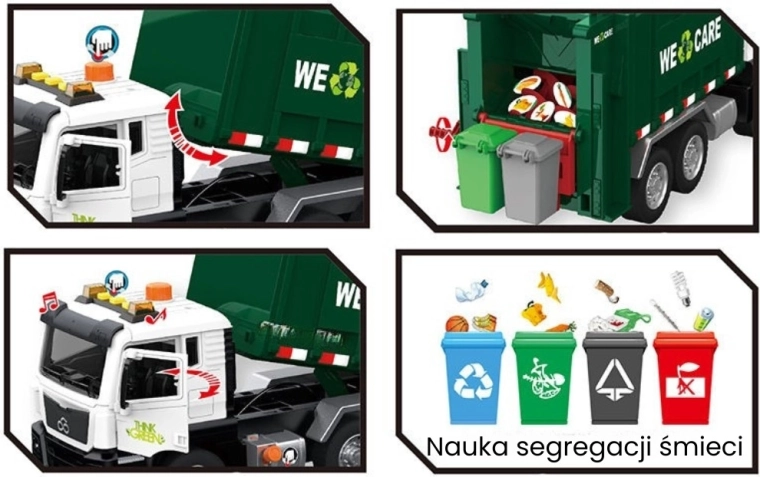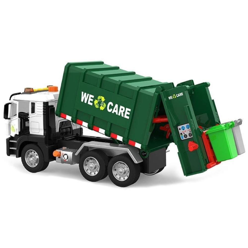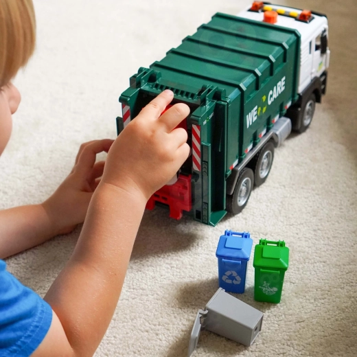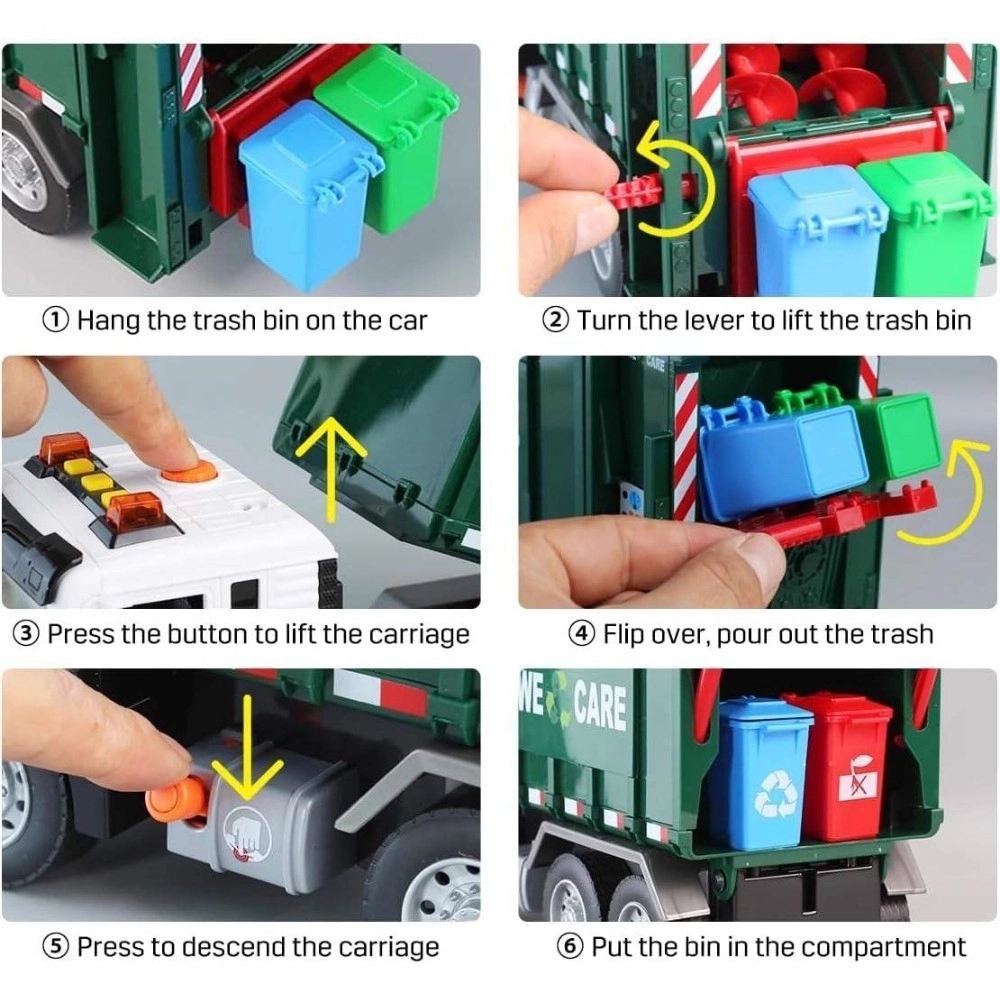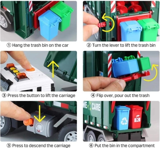 Solleva il piccolo bidone, svuota il contenuto nel cassone e poi apri il portellone posteriore per lo scarico. La meccanica realistica insegna ai bambini i principi della raccolta dei rifiuti.