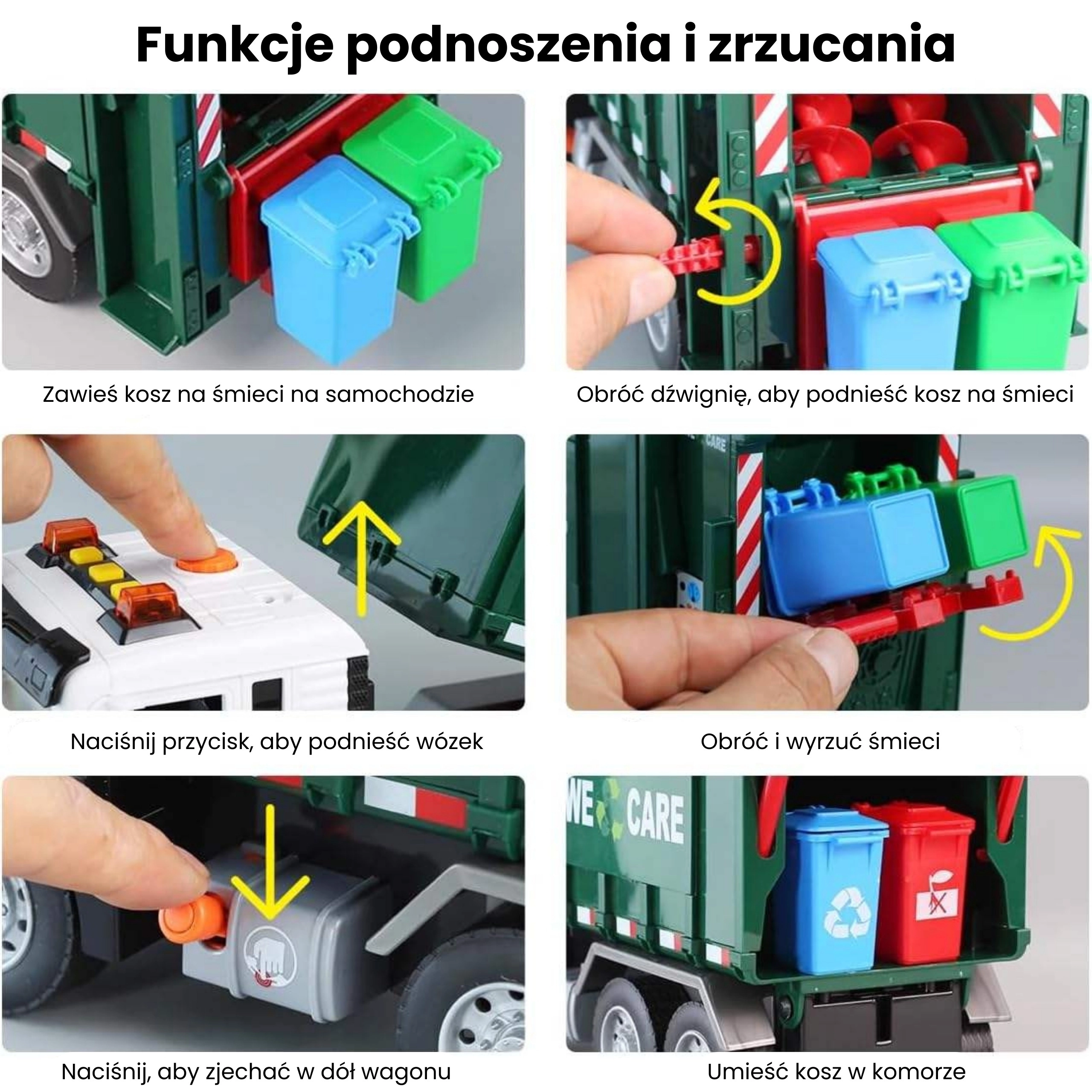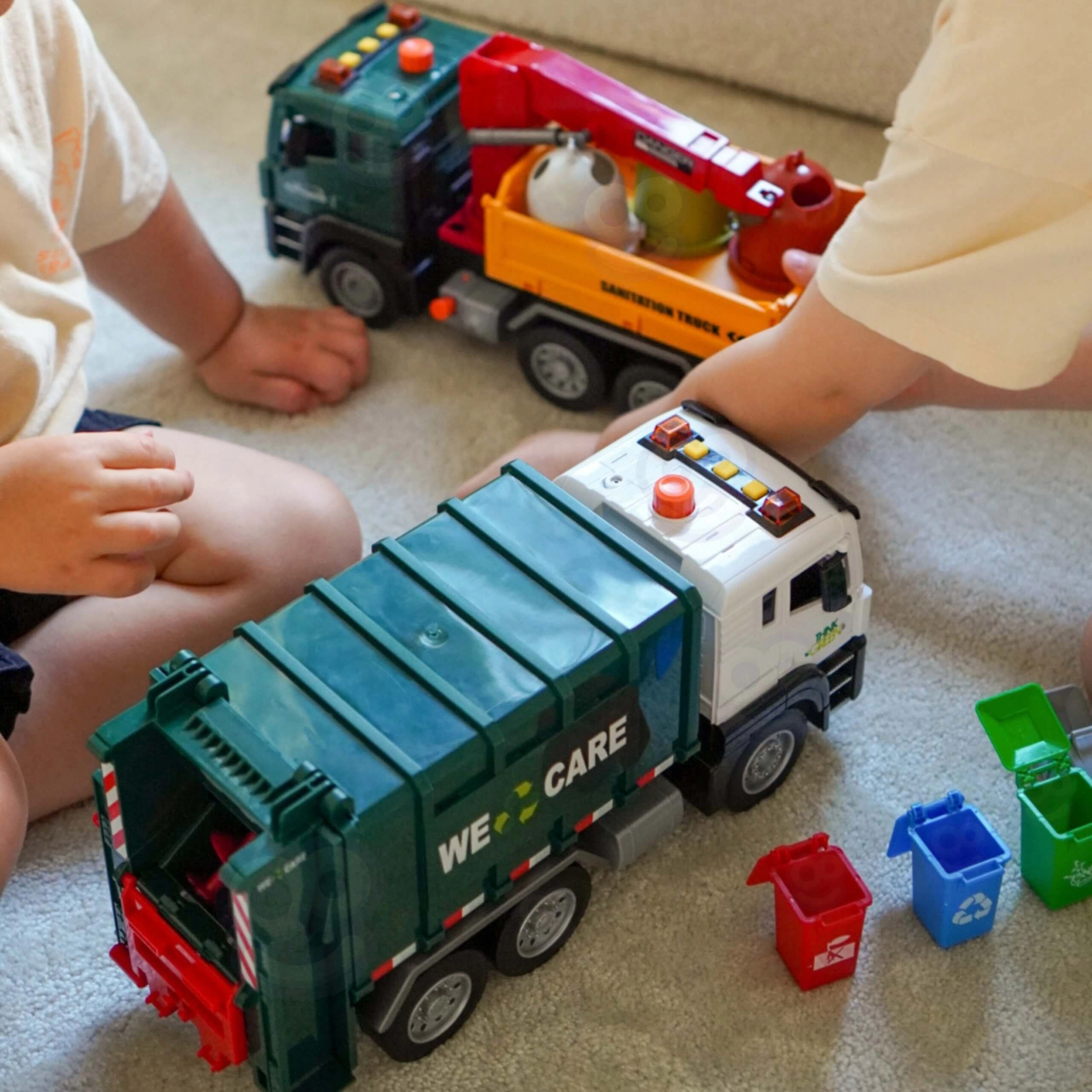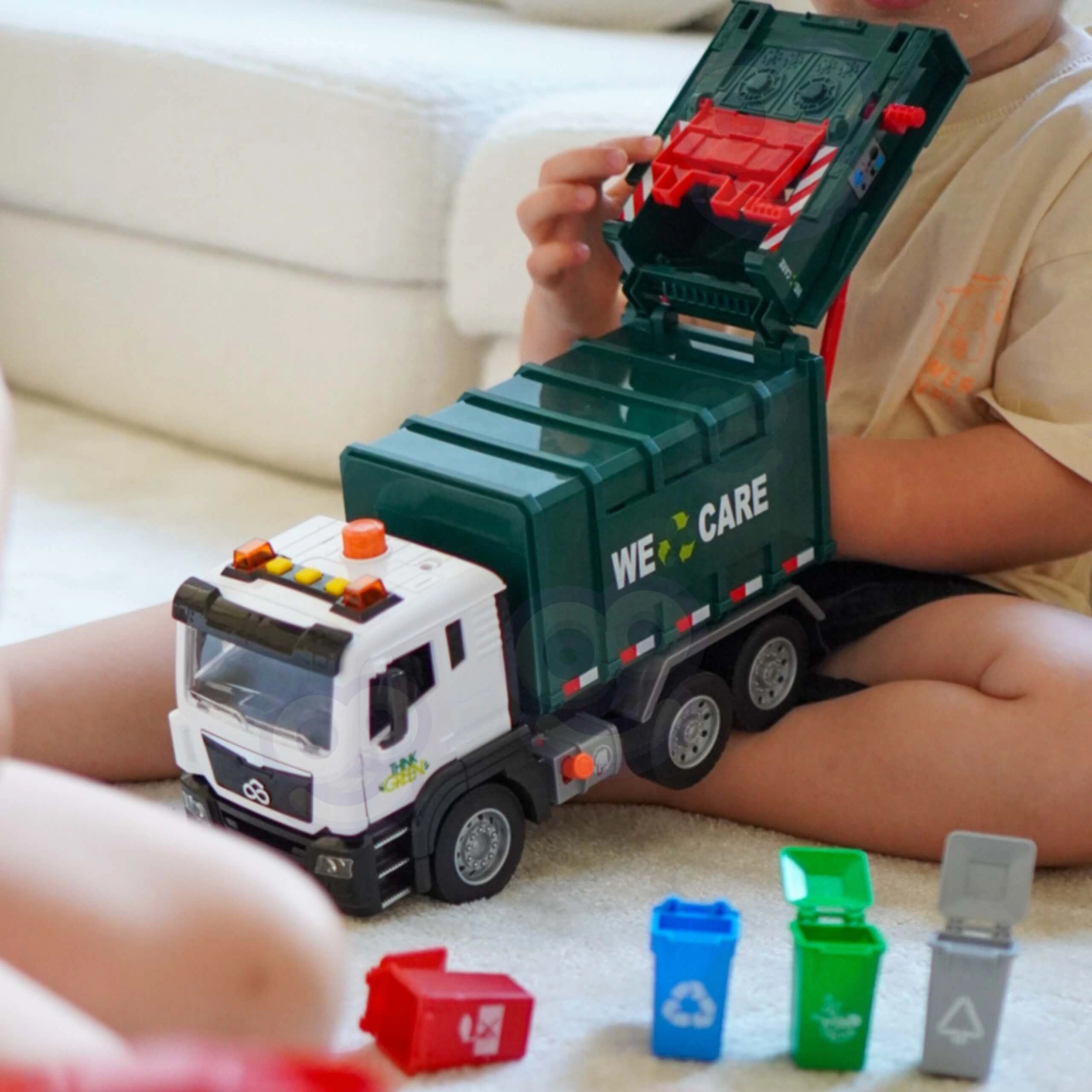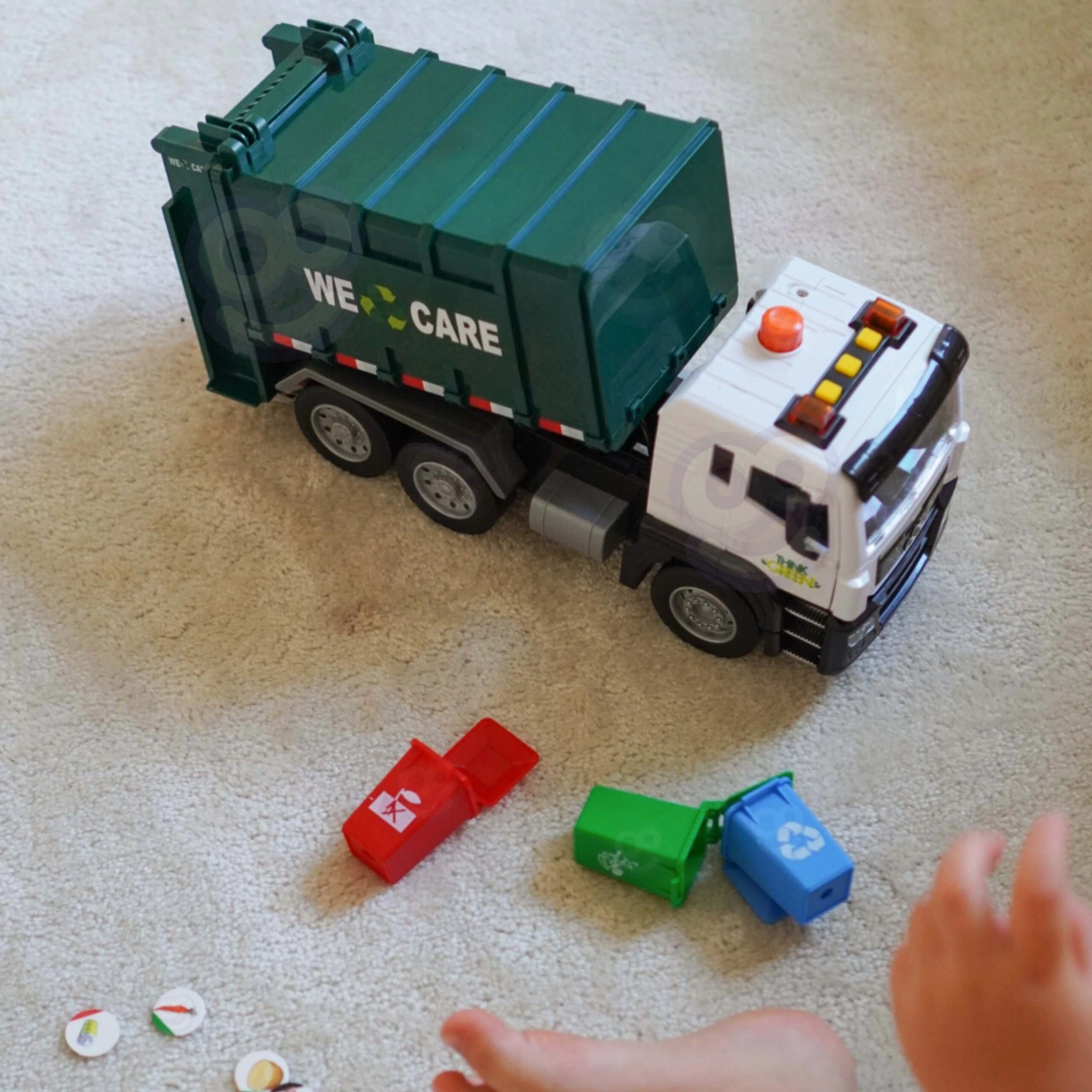 Solleva il piccolo bidone, svuota il contenuto nel cassone e poi apri il portellone posteriore per lo scarico. La meccanica realistica insegna ai bambini i principi della raccolta dei rifiuti.