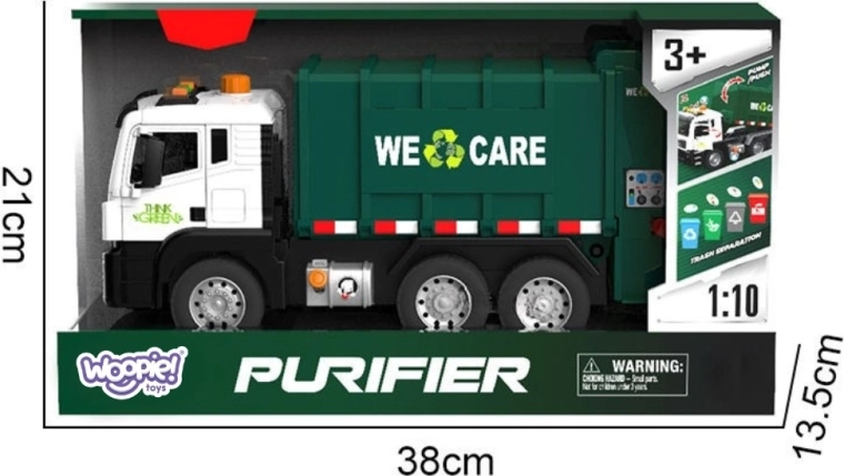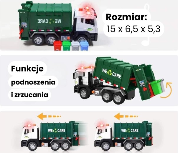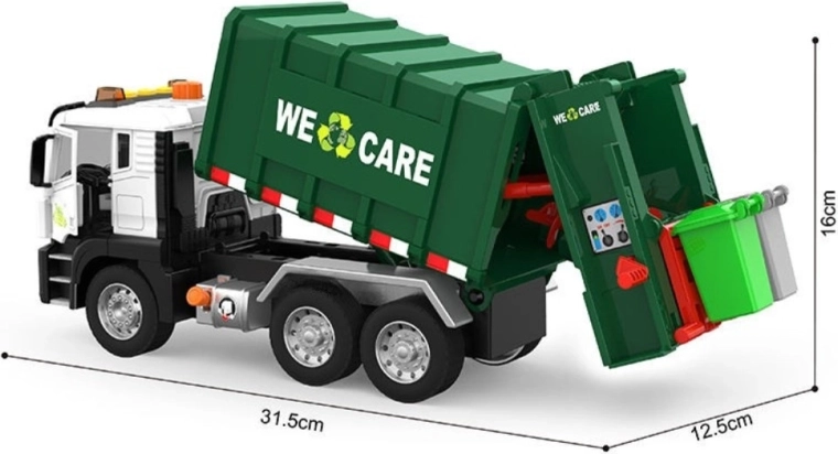 Questo camion dei rifiuti dettagliato con la scritta “WE CARE” offre ai bambini un gioco autentico di raccolta dei rifiuti. Grazie al braccio di sollevamento funzionante, al portellone posteriore apribile e ai mini bidoni inclusi, i bambini possono sperimentare procedure reali di selezione e svuotamento dei rifiuti. Gli effetti luminosi e sonori integrati aumentano il divertimento e stimolano la fantasia.