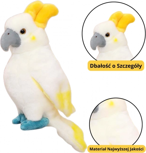 Il peluche cacatua 1 una splendida realizzazione di un giocattolo a forma di uccello esotico, che combina valori estetici, educativi e sensoriali. Il suo aspetto unico 1 il piumaggio bianco, caratteristico con cresta gialla, becco grigio e zampe blu, lo rendono una scelta eccellente come animaletto da coccolare o come decorazione nella cameretta dei bambini.