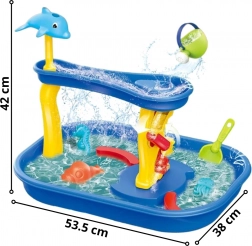 Giocattolo d'acqua 2 in 1 con ruota d'acqua e scivolo - ideale per l'estate! Crea una zona di gioco unica per i bambini in giardino o in casa. Il tavolino giocoso e colorato combina il divertimento della pesca, il rilascio dell'acqua e l'osservazione del suo flusso attraverso strutture divertenti come la ruota d'acqua o lo scivolo con il delfino.