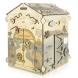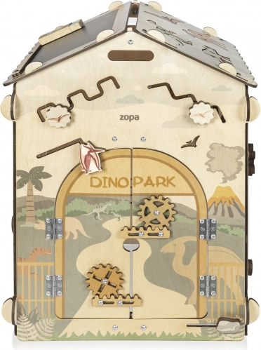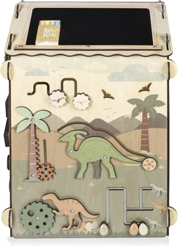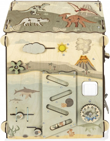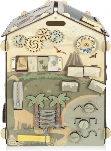 Il tetto funge da lavagna nera per gessetti, i puzzle 3D di dinosauri sostengono l’immaginazione spaziale e le tessere girevoli con impronte guidano i bambini all’attenzione e alla logica. Elementi pratici come cerniere, lacci, ingranaggi e labirinti aiutano a sviluppare l’autonomia.