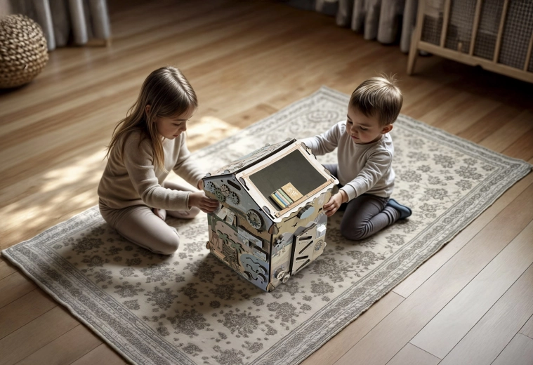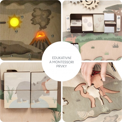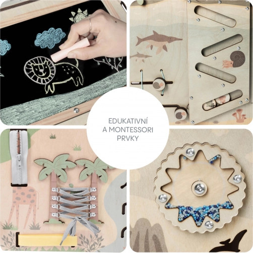 Labirinti, ingranaggi, interruttori, cerniere e lacci allenano coordinazione mano–occhio, destrezza delle dita e pazienza nella risoluzione dei compiti.