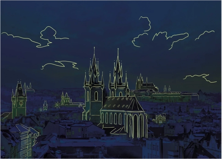 Questo elegante puzzle neon con il motivo di Hradčany è un'ottima scelta per il relax e come regalo per gli amanti di Praga. Dopo l'esposizione, i suoi dettagli al neon si illuminano al buio, così l'immagine finale appare straordinariamente attraente sia di giorno che di notte.