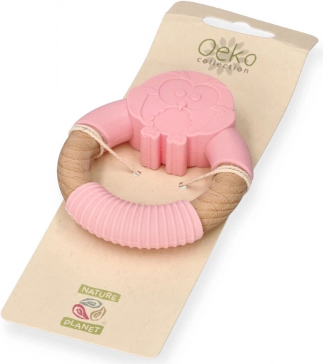 Massaggiagengive in silicone rosa Nature Planet a forma di gufetta. Morbido, leggero, facile da lavare, adatto da 0m+. Dimensioni 7 × 8,5 cm. Conformità CE.