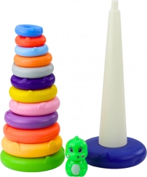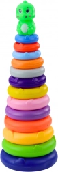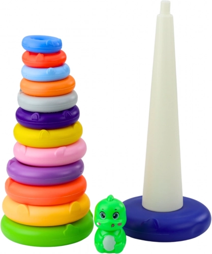 Questo giocattolo è composto da una base solida e stabile, un piolo alto e 13 anelli colorati di diverse dimensioni. Tutti gli elementi sono realizzati in plastica leggera e resistente, sicura per i bambini piccoli. La parte superiore della torre è decorata con una simpatica figura di dinosauro che attira l'attenzione dei bambini e li incoraggia a giocare ancora.