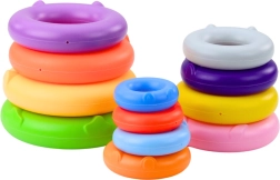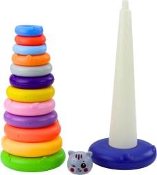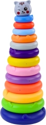 Questo giocattolo è composto da una base ampia e stabile, un piolo alto e 13 anelli colorati che il bambino può impilare da solo per creare una torre impressionante. In cima si trova la figurina di un dolce gatto, che incoraggia ulteriormente il bambino a giocare e costituisce un elemento visivo attraente.