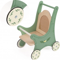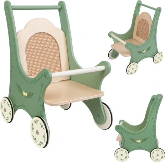 Passeggino per bambole in legno - stile vintage con schienale in rattan! Goditi l'unica atmosfera retrò grazie alla struttura verde con ornamenti floreali e schienale in rattan. Giocattolo ideale per bambini che amano prendersi cura delle loro bambole e peluche.