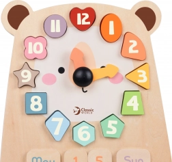L'orologio in legno a forma di orsetto del marchio Classic World è un giocattolo versatile che aiuta i bambini a imparare il tempo, i giorni della settimana, i mesi e a riconoscere i colori e le forme. Grazie ai blocchi rimovibili con numeri e nomi, i più piccoli possono esercitare la coordinazione mano-occhio, il pensiero logico e le abilità manuali.