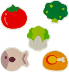 La tavola include anche 5 magneti colorati a forma di cibo che aiutano i bambini a riconoscere diversi tipi di alimenti.