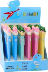 La parte superiore della penna è adornata con un personaggio di dinosauro in gomma, che funge da elemento decorativo e aggiunge un tocco di fascino complessivo. Grazie al coperchio, la punta di scrittura è ben protetta dall'essiccazione, e un pulsante incorporato attiva l'effetto illuminazione LED, che si accende ad ogni pressione.