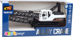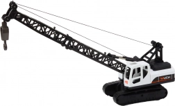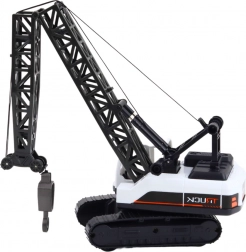 La gru ha un braccio mobile con gancio che può essere alzato e abbassato. Il braccio della gru si muove su giunti e la base rotante consente una rotazione completa di 360°. L'intera struttura è costruita su un robusto telaio a cingoli, che aumenta il realismo e la stabilità. Il giocattolo è progettato in colori bianco e nero con dettagli che imitano le attrezzature professionali da costruzione.