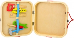 Il set include strumenti di base come seghetto, martello, cacciavite, chiave piatta, pinze e righello, oltre a elementi di montaggio colorati - viti, dadi e blocchi di legno perforati che il bambino può facilmente avvitare e collegare.