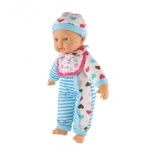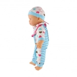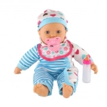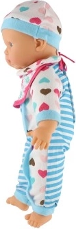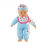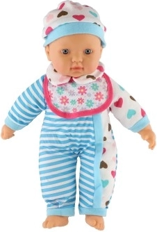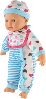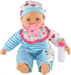 La bambola indossa un abitino a righe blu e bianche con teneri cuoricini. È dotata di ciuccio e biberon, che aggiungono un elemento realistico al gioco.