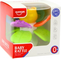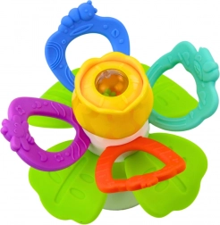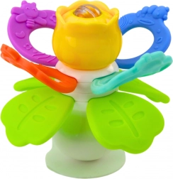 La parte centrale rotante del fiore invita il bambino all'attività e al rafforzamento delle mani. I petali colorati sono fatti di un materiale morbido ed elastico, adatto per la dentizione - ideale durante il periodo della dentizione. Arricchito da piccole palline all'interno del fiore, che tintinnano dolcemente con il movimento, stimolano l'udito e la vista del bambino.