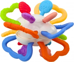 Questo giocattolo è composto da due parti centrali mobili e rotanti che il bambino può muovere, aiutando a esercitare la presa e sviluppare la coordinazione mano-occhio. Inoltre, l'intero giocattolo è circondato da maniglie colorate ed elastiche di varie forme e texture, realizzate in materiale sicuro e morbido simile alla gomma. Questi elementi sono ideali per mordere, offrendo sollievo durante la dentizione.