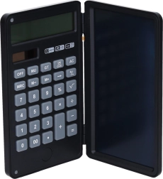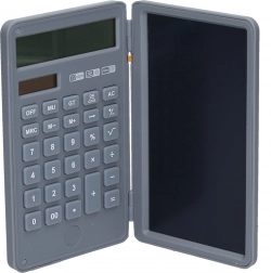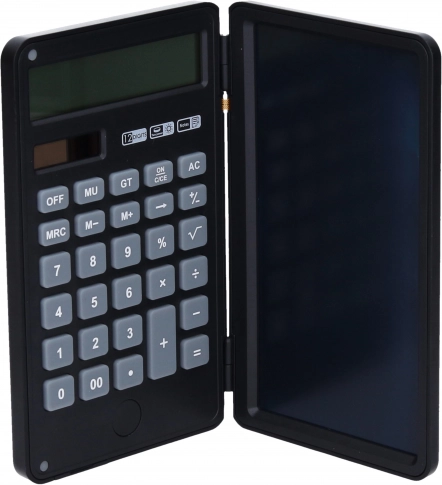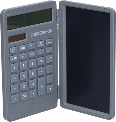 Completamente aperta, la calcolatrice raggiunge dimensioni di 18 x 15 cm, garantendo un uso confortevole. Si può scegliere tra due eleganti varianti di colore: nero e grigio.