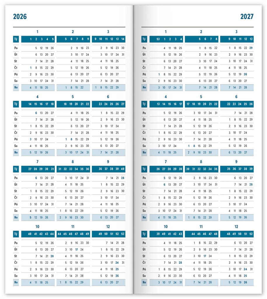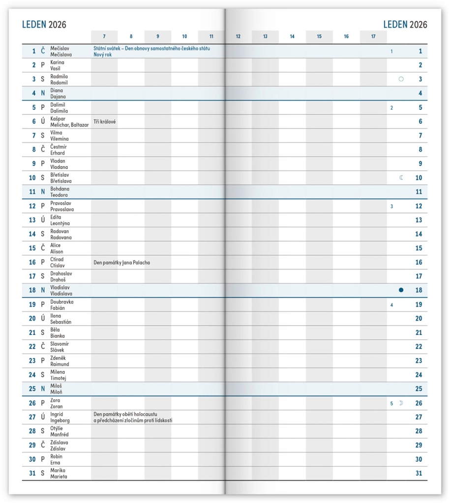 • Include un calendario ceco con nomi, festività e giorni commemorativi.