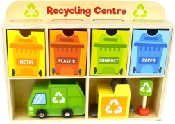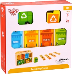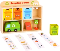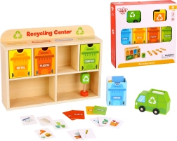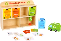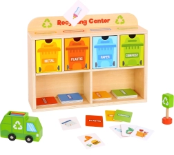 Con il Centro di Riciclaggio di Tooky Toy, i bambini imparano come differenziare correttamente i rifiuti. Ogni carta mostra rifiuti di materiali diversi che i bambini metteranno nel camion della spazzatura, poi nel separatore e infine nel giusto contenitore disposto nella scatola di legno.