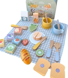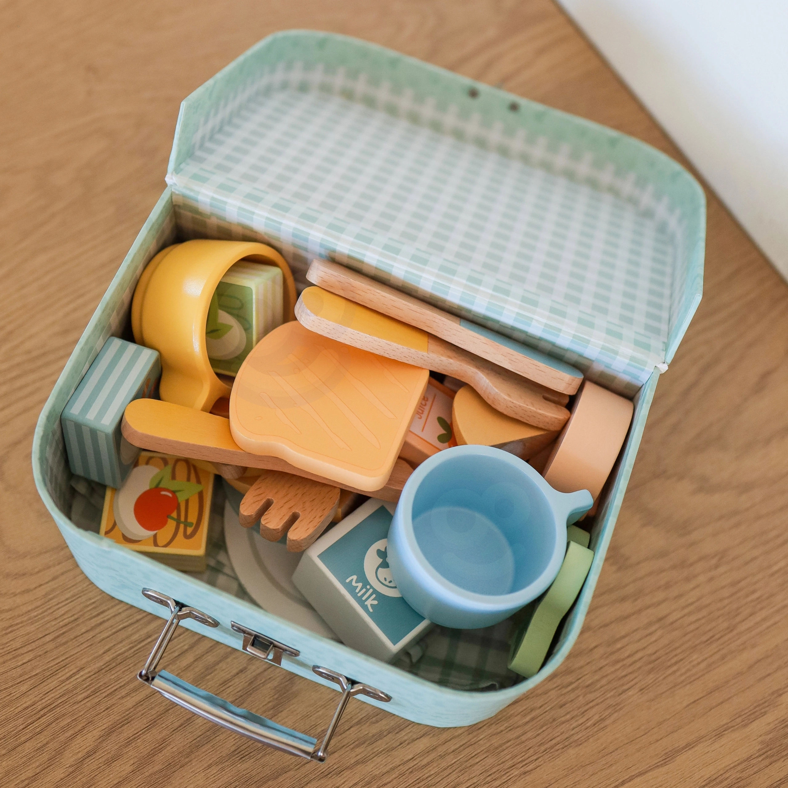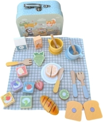 - Contenuto del set: valigetta, tovaglia a quadretti, 2 tazzine con piattini, 2 piattini, 2 cucchiaini, 2 forchette, 2 coltelli, 2 toast/crostini, croissant (da tagliare), frutta (fragola, limone, kiwi, uva – da tagliare), 2 biscotti, cartoncino del latte e cartoncino del succo.