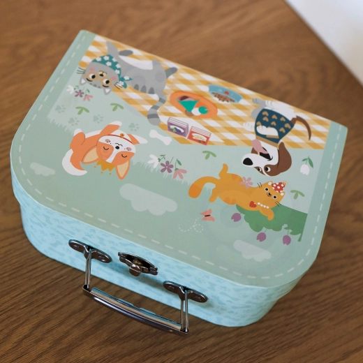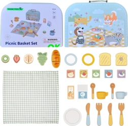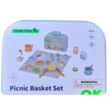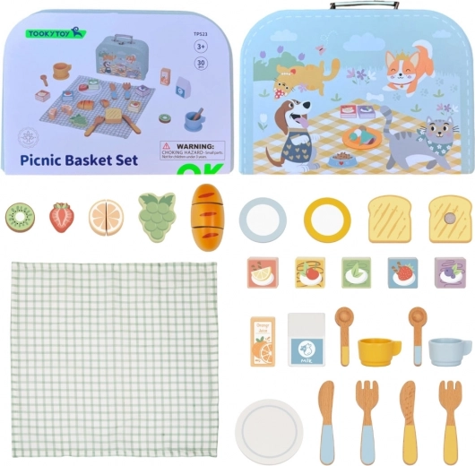 Il set da picnic in legno TOOKY TOY nella graziosa valigetta turchese offre ai bambini un gioco realistico di preparazione e servizio dei pasti. La frutta e i prodotti da forno colorati possono essere “tagliati” e riattaccati; non mancano piattini, posate, tazzine né i cartoncini di latte e succo. Il gioco sviluppa la motricità fine, la coordinazione occhio–mano e le abilità linguistiche durante il naturale gioco di ruolo.