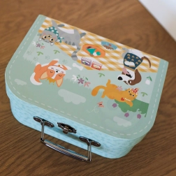 Elegante valigetta turchese con manico e chiusura in metallo che tiene tutti i pezzi in ordine. Facile da trasportare per gite e visite.