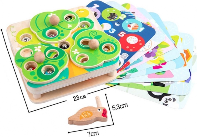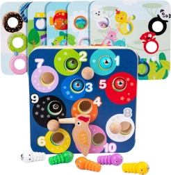 Questo gioco educativo in legno 2-in-1 porta ai bambini la gioia della scoperta. Le “foglie” verdi girevoli nascondono i vermetti magnetici e aggiungono al gioco un elemento di sorpresa e sfida. L’uccellino di legno con becco magnetico aiuta i bambini a mirare con precisione, afferrare e trasferire i vermetti nei fori, rafforzando la motricità fine e la pazienza.