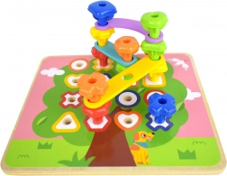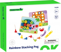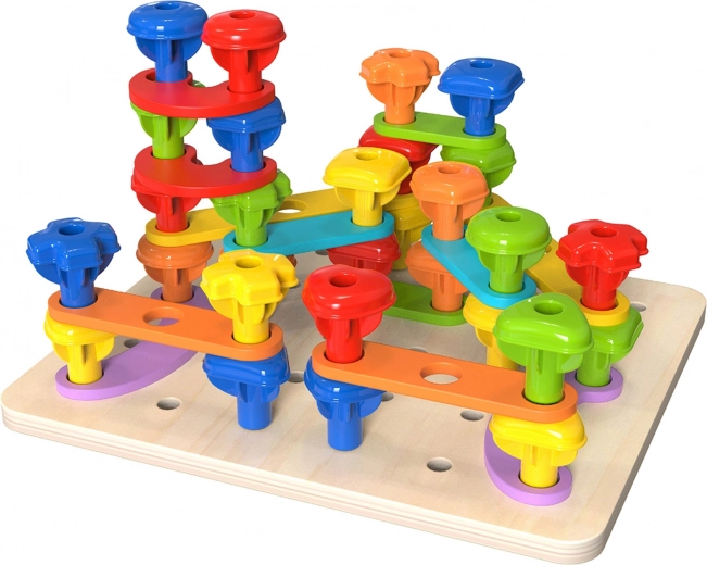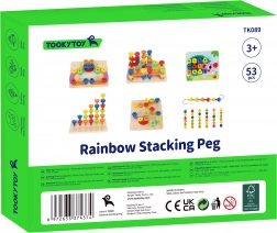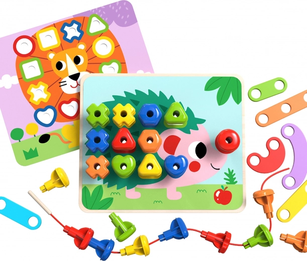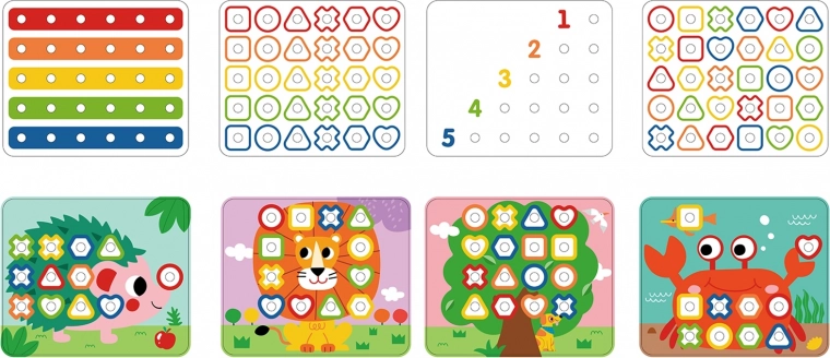 Questo set multifunzionale permette ai bambini di esercitarsi in diverse abilità. Grazie ai pioli colorati, si possono creare forme diverse e imparare a riconoscere i colori. Il set include 30 pioli diversi, che variano per forma e colore, e 8 carte con simboli diversi. Per i bambini che amano creare, c'è anche un ago in legno con un filo per infilare.