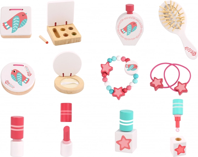 - Il set include accessori in legno: smalto per unghie, rossetto, braccialetto, orecchini, spazzola per capelli, profumo, cipria e ombretti.