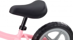 La struttura con robusto tubo del telaio in acciaio e silenziose ruote EVA da 12" assicura una guida fluida e confortevole senza rischio di forature. L'altezza regolabile della sella (33,5–48 cm) e del manubrio (51–56 cm) consente di adattare la balance bike all'altezza attuale del bambino. La larghezza del manubrio di 41 cm e la breve portata verso le manopole favoriscono un controllo sicuro.
