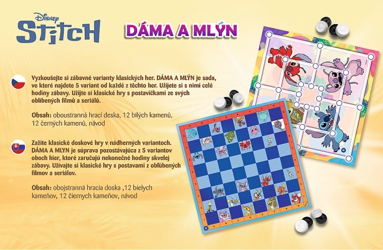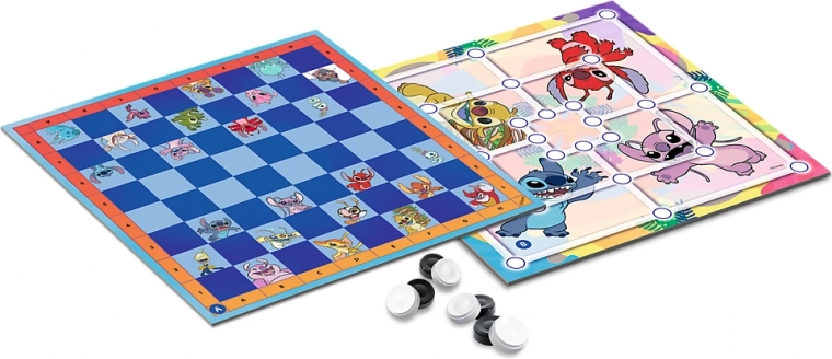 Scopri un divertimento senza tempo con i personaggi preferiti Lilo e Stitch. Questo set combina due classici strategici – Dama e Mulino – in un unico kit elegante che piacerà a giocatori piccoli e grandi. Il design allegro e illustrato motiva i bambini al gioco e allo stesso tempo sostiene il loro ragionamento e la pianificazione.