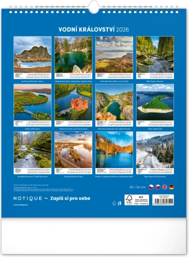 Calendario da parete Regno delle Acque 2026 con 12 fotografie delle bellezze acquatiche ceche e calendario ceco. Formato 30 x 34 cm.